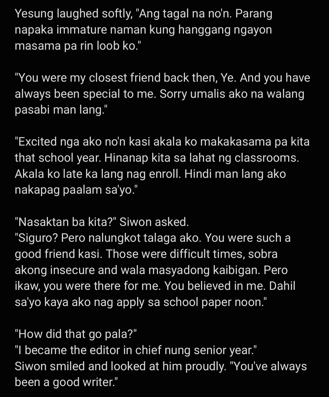 Umalis din kasi ako nung hapon at umuwi na ng gabi nasa labas nanaman siya nun kaya di ko talaga siya naaabutan. Umalis na walang paalam. Naalala ko noon Hindi tayo nagpapansinan Hindi tayo nagkikibuan Hindi tayo naguusap Lumilipas nga siguro ang isang araw na wala tayong pinaguusapan.