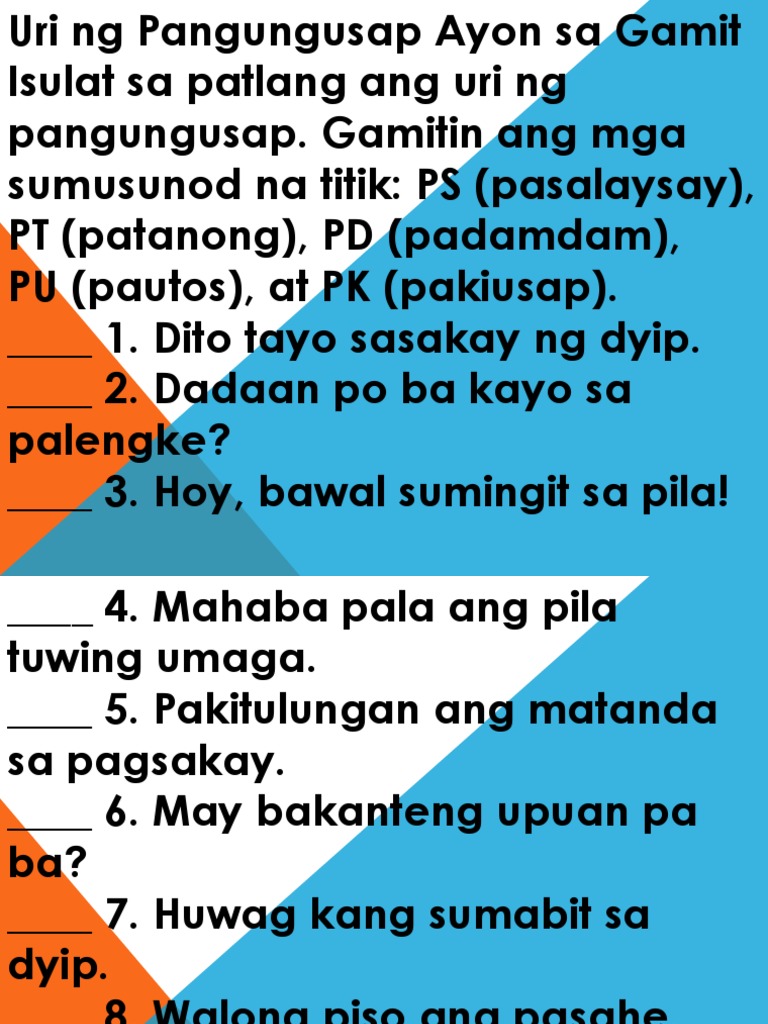 Pasalaysay o paturol Patanong Pautos o Pakiusap Padamdam These free Pangungusap worksheet will test your mastery on the topic. Pangunahin at Pantulong na Kaisipan Panuto. MyMemory Worlds Largest Translation Memory.